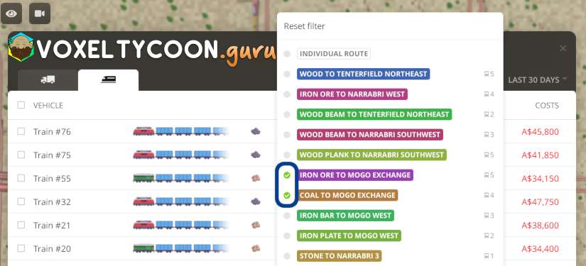 - When you click the filter icon, a list of routes appears where you can select the routes you want to filter by