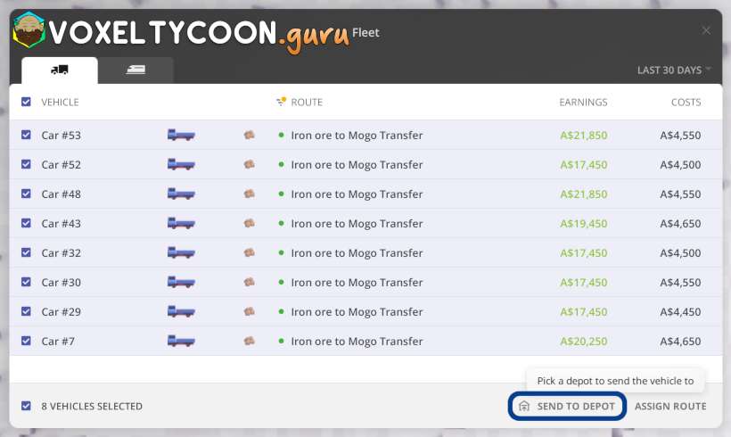 - The Send To Depot button allows you to send one or more vehicles to a garage/depot